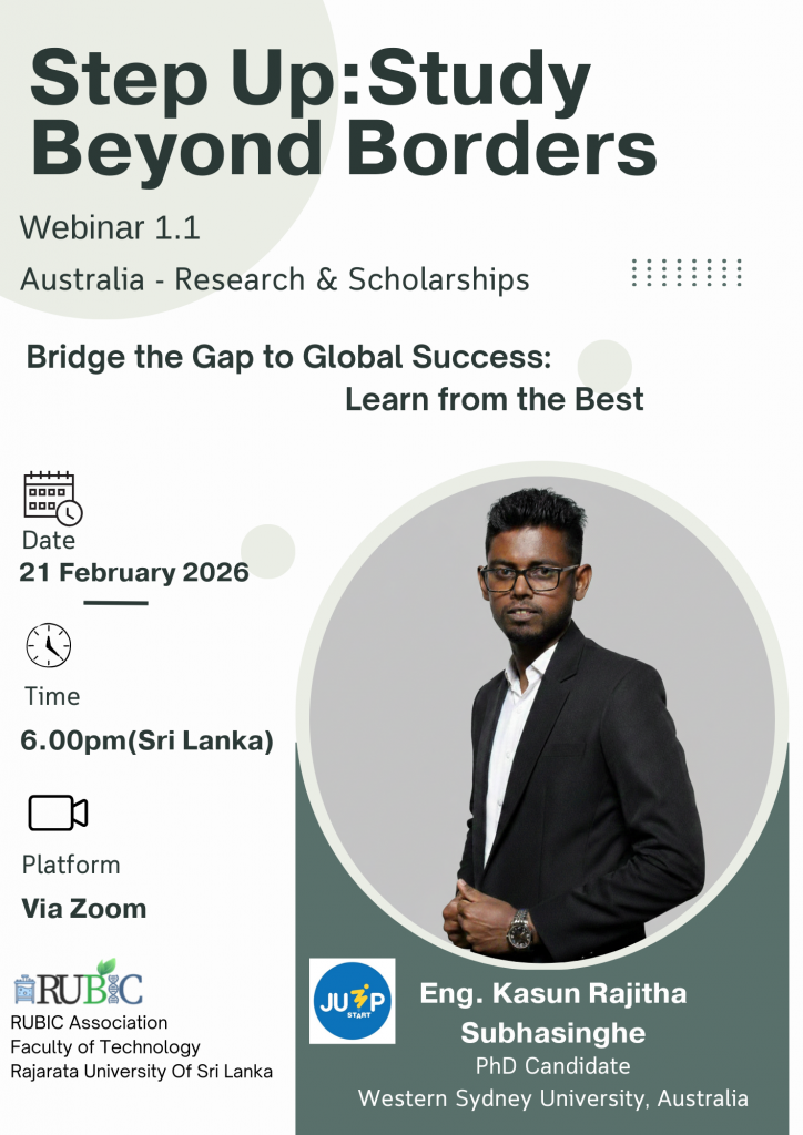 - You are warmly invited to attend βStep Up: Study Beyond Borders β Webinar 1.1β an insightful awareness session on research opportunities and scholarships in the Australia , conducted by Eng. Kasun Rajitha Subhasinghe, PhD Candidate, Western Sydney University, Australia.